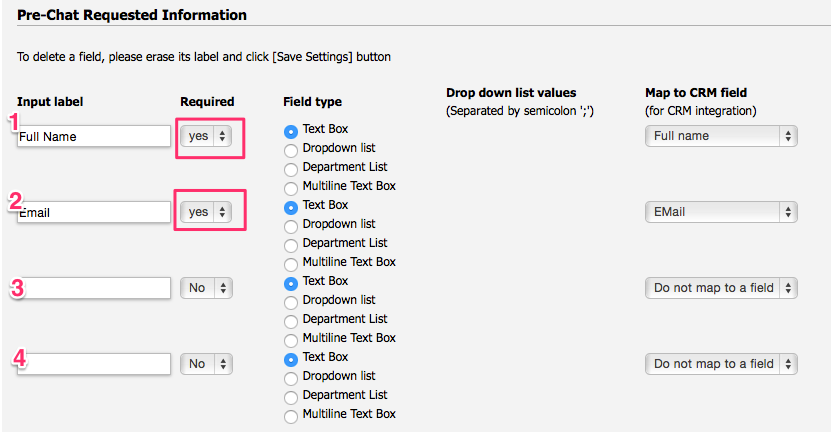 These settings are located at Admin Panel->Chat System->Customization->Pre-chat requirements