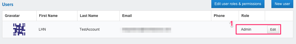 2. Select the User ID and the Admin Role and click Edit (1). Copy the API Token from this screen (2).