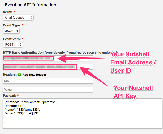 3. In the HTTP Basic Authentication Username field enter your Nutshell User ID / Email address. Paste the API key you copied from Step #1 in the password field. No information is needed in the Headers fields.